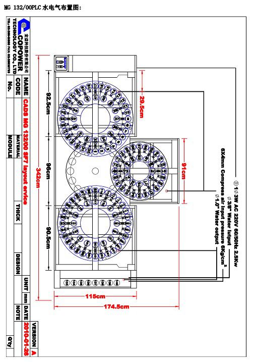 | 需要由客户自备的物品: 1. 商用电脑2台 ----CADS MG 132/00 PLC无管路滴液系统控制用1台 ----CAMS90 母液调制系统控制用1台 商用电脑配置: · Intel Pentium E及以上处理器 (英特尔主板芯片组) · 内存 1G及以上 · 硬盘 250GB及以上 · 彩色显示器 (17″及以上) · 中英文标准键盘 · DVD 光驱 · WINDOWS XP 中文专业版 · 主板必须带有COM接口 2. 联网RJ45对等线1条,长度依实际情况定 3. 多功能电脑插座2只 4. AC 220V 3KW稳压器1个------- 用于滴液系统 5. 内径3/8英寸输水波纹管------用于输水管道接口分别到滴液和调液系统的连接 6. 内径1英寸排水波纹管-----用滴液和调液系统至排水管连接 安装要求工作环境: 仪器应当被安装在一个无震动的场所,室温不能高于25℃,相对湿度在60~80%之间,以及最小的空气流动。绝对要远离甘油机放置的房间,否则易引起机台短路。 电源: 220V±5%,50/60Hz,3 线(火线,中线,地线)单相电源, 电源请与工厂现场的动力电源分开,以免被干扰。MG 132/00 PLC 的功率为 1.5KW。(备注:一定要接地)为保证工作正常,需要安装3KVA交流电压稳压器,伺服型效果更佳。这主要是为了避免电波脉冲对机器的影响以及保证电磁阀36V工作电压的正常,确保机器的滴定速度及稳定性。 空气管路: 4~6kg/c㎡,1/2马力,内径Φ4mm,外径Φ6mm的塑料管连接滴定系统。压缩空气中不能含油,如含油则会影响滴定效果,需加装化油器。如工厂气压不稳定,建议加装减压阀。特别请在水槽边加装一个空气管路,以便接入我们提供的清洗空气枪。 进水: 1~2kg/c㎡,3/8英寸内径的水管连接滴定系统。连接的塑料管需内含金属丝网。随仪器提供一个水过滤器,但是如果水中含有大量的藻类,杂质时,应再加装一个水过滤器,两个串联。如工厂水压不稳定,建议加装减压阀。 出水: 1英寸内径的排水管。排污水口出水畅通。塑料管需内含金属丝网。